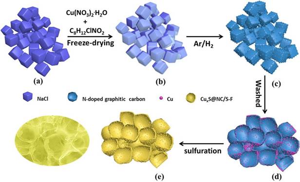 最近,公司低维材料与清洁能源创新型科技团队以氯化钠晶体为模板、盐酸多巴胺为碳源和氮源、硝酸铜为铜源,经过冷冻干燥和高温还原等过程,成功制备出铜和氮共掺杂的三维多孔石墨化碳网络复合材料(CuxS@NC/S-F)。研究发现,当CuxS@NC/S-F应用于锂硫电池方面时,具有较大的优势:I)三维多孔碳结构有利于电荷转移和电解质的浸润;II)具有良好导电性的硫化铜可以与锂反应,在锂硫电池电压范围内贡献部分容量;III)硫分子在CuxS中的分散提高了活性物质的利用率,并且Cu作为放电产物有利于提高电极整体导电性;IV)CuxS材料可以作为催化剂减少放电产物(Li2S)在电极表面的不可逆沉积。因此,CuxS作为锂硫电池的硫基质具有很大的优越性和良好的应用前景。最后,作者也通过机理分析发现,作为锂硫电池的硫基质材料,该掺杂网络对聚硫化物具有高效的催化作用,并使电池表现出快速氧化还原反应的特性。