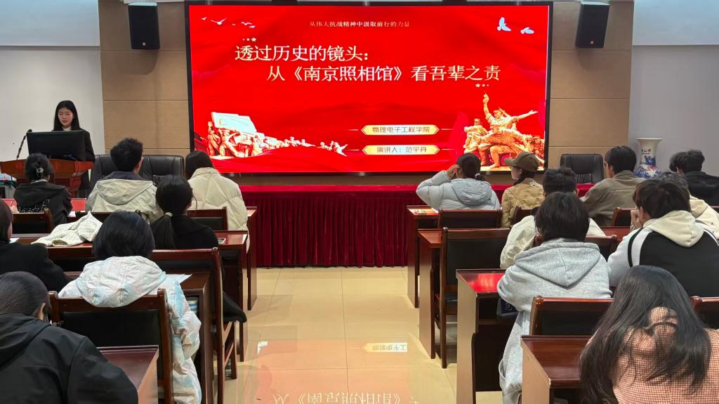 比赛现场,参赛选手们围绕抗战历史与爱国主义精神,借助多媒体和历史叙事展开精彩讲述。他们深情回顾革命先辈的英勇事迹,重温民族觉醒的伟大历程,深刻阐释抗战精神的时代价值。选手们以真挚的情感和饱满的热情,将一段段厚重的历史娓娓道来,巧妙联系当代青年的责任担当,号召同学们从抗战历史中汲取精神力量。参赛选手们富有感染力的表现,赢得了现场观众的阵阵掌声。
