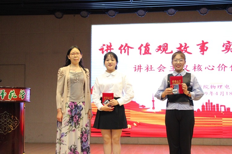 参赛选手结合制作精美的PPT,围绕社会主义核心价值观主题,密切联系实际,热情饱满、慷慨激昂,依次讲述自己准备的社会主义核心价值观故事。2018级物理学班朱昕雨通过讲述守岛英雄王继才夫妇克服种种困难守卫孤岛32年奉献一生的事迹向在场学子展示了社会主义核心价值观之爱国的魅力,鼓励学子们以“时代楷模”为榜样,将爱国之情融入日常生活的小事中。2017级应用物理学班周小雨以“傻大兵”为题,展现了就职十大高危工作之首的消防员们的强烈责任感与使命感,引导学子们服务人民、服务社会,弘扬社会主义职业精神,积极践行社会主义核心价值观。2018级物理学班薄伟以爱国为主题,从“炽热中国心,悠悠爱国情”两个关键,“何为爱国”为切入点,为在场学子分享了两弹一星元勋钱学森的爱国故事,引发在场学子深思。期间,学子们认真聆听、掌声雷动,纷纷表示获益匪浅。经过激烈的角逐,周小雨和杜聪聪获得一等奖,领导老师为获奖选手颁奖并合影留念。