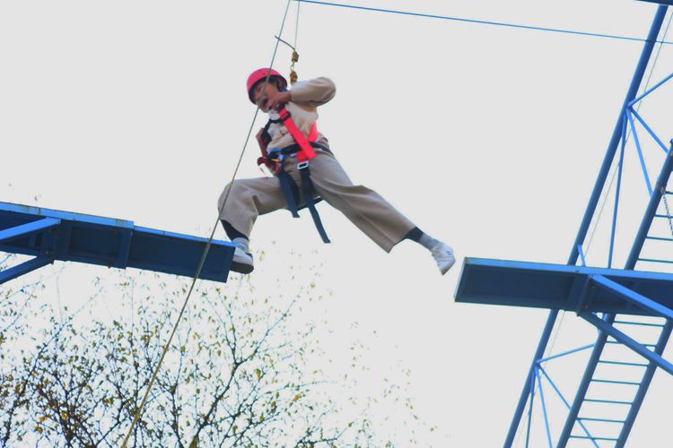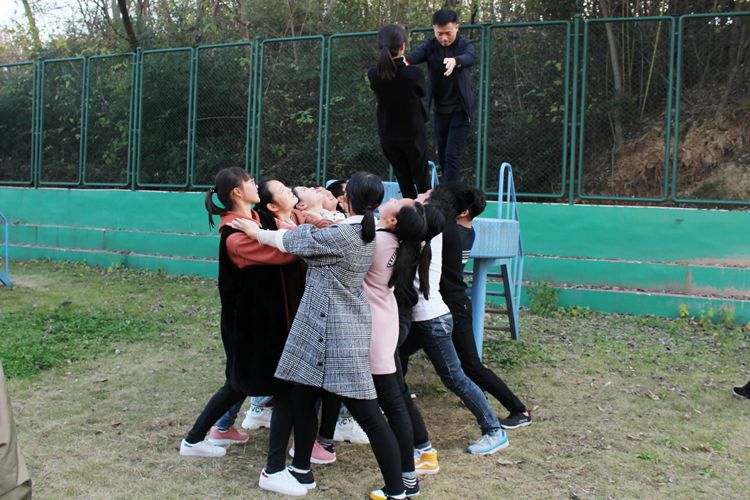 活动准备阶段,学员均分为三组并制定所在队伍名称。活动内容包括“萝卜蹲”“信任背摔”“高空断桥”“穿越电网”等游戏,类型丰富、趣味十足。其中, “高空断桥”极具挑战性,攀爬者在现场指导人员帮助下,装备安全服、安全绳等保护自身安全,并通过跨越、落地等动作穿越八米高断桥完成挑战,队员们相互鼓励,一同克服恐惧。“信任背摔”游戏中,工作人员指导部分队员依次以手搭肩、摆正姿势,确保被摔者安全从平台落下,参与人员间齐心协力、彼此信任,充分展现了当代老员工善于团结合作,敢于挑战自我、超越自我的独特魅力。期间,工作人员耐心指导、仔细讲解,时刻关注学子安全,其认真负责、和蔼可亲的态度赢得在场师生一致好评。游戏结束,组内成员相互交流并浅谈自身感悟,现场气氛热烈和谐。