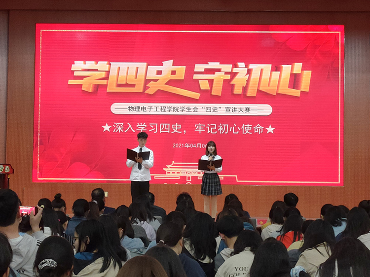 为深入贯彻落实习近平总书记关于开展党史、新中国史、改革开放史、社会主义发展史学习教育的重要讲话精神和公司《关于开展党史学习教育的实施意见》和《关于开展党史学习教育的实施方案》等工作安排,bevictor伟德国际于4月6日晚在逸夫楼多功能厅顺利举办“学四史,守初心”四史宣讲大赛。比赛邀请党委学工部副部长苏和,校团委社团工作部副部长任玺,法学与社会学公司党委副书记樊德玲,文公司党委副书记杨乐,物理电子工程公司党委副书记李刚担任评委,bevictor伟德国际团委老师黄钰莹和牛文娟以及近500名员工共同参加。