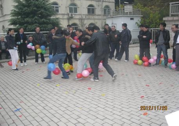 乒乓球比赛更是难上加难,教师需单手执拍将球传给对面的队友,而且球不能掉,否则,需从所在起点重新开始。比赛再度陷入紧张阶段。而踩气球比赛则以其轻松的模式缓解现场氛围的同时,也使运动会达到了高潮。教师们两两分组,分成三组,每人左右脚各绑三个气球,在哨声响起后,各队互踩对方的气球。教师们在踩别人气球的同时,往往顾及不到自己的气球而被别人踩破,后悔的更卖力的踩对方的球,此时的他们像是回到了童年,疯狂、快乐。最后一场是雷前友书记和员工进行比赛,他们一边保护自己的球,一边踩对方的球,砰砰声和师生的笑声融合在一起,构成了此时最美妙的声音。