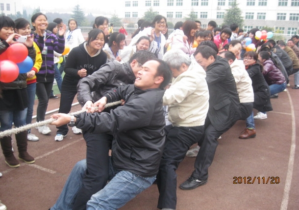此次趣味运动会分为师生拔河比赛、摇呼啦圈、袋鼠跳跳乐、乒乓球接力赛和踩气球5个比赛项目。“加油!加油!…….”随着一阵加油声响起,师生拔河比赛正式开赛。第一组是教师队对阵教师队,在口哨吹响的瞬间,雷前友书记和余本海经理带领各自的队伍齐心协力,使出浑身解数,将绳子拉向自己所在队伍。双方斗气十足,赛势甚为紧张。经过三个回合的激烈角逐,余本海经理所在的一队获得胜利。第二组是教师队对阵员工队,只用了两个回合员工队就败下阵来。输掉比赛的教师队和员工队不甘心,希望在下个活动项目里展示自己的运动强项,而赢得这次比赛的教师队更是激情高涨,舒活筋骨准备下一项比赛——摇呼啦圈。