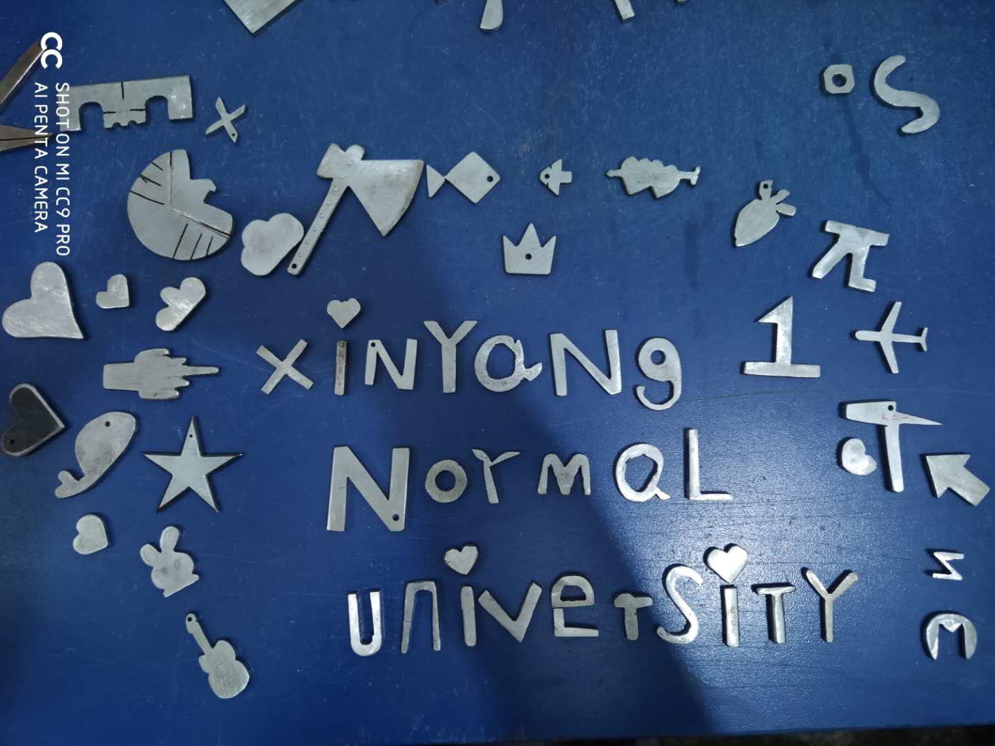 金工实习分为车工实训和钳工实训两项,车工实训内容为多人一组使用车床共同加工一根简易阶梯轴,钳工实训要求员工熟练使用台式虎钳、锉刀、钢锯、台钻等工具独立完成一件作品。在师生的共同努力下,员工们圆满完成了实训任务,特别是在钳工实训环节,学子们设计制作了“Xinyang Normal University”的公司英文全称图案和其他一些妙趣横生的作品。