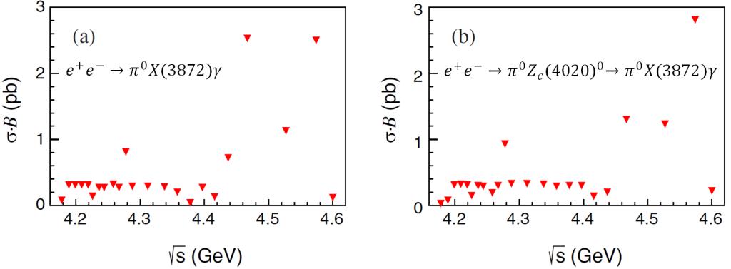 图2:e+e-->pi0X(3872)gamma和e+e-->pi0Zc(4020)->pi0X(3872)gamma的实验上限测量结果