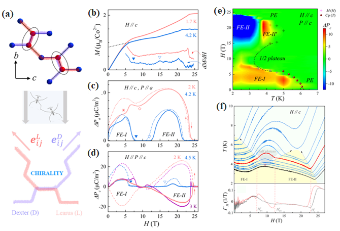 磁场调控电极化是一个有趣的前沿研究课题。陈瑞博士在前期研究工作中发现,Co2V2O7在H//b方向上具有显著的量子磁化平台、新奇多铁性和磁场诱导的连续电极化转换现象[Phys. Rev. B 98, 184404 (2018),Phys. Rev. B 100, 140403 (2019)]。而当磁场沿着a和c轴时,仅仅在M(H)曲线上发现了两个异常信号,难以确定磁相边界。由于磁场诱导的量子磁化平台和铁电性同时存在于Co2V2O7这一体系中,表明该体系可能是研究多铁量子临界的候选材料。为进一步探究,陈瑞博士与王俊峰研究员课题组合作,利用强磁场磁化、电极化和绝热磁卡效应测量技术对Co2V2O7 c轴开展了系统研究。研究表明,当H//c时,Co2V2O7在3-5 K温度范围内具有两个铁电相(FE-I和FE-II)。这两个相被中间的顺电相隔开,该顺电相对应于升温引起的1/2磁化平台。当温度进一步升高时,FE-II和FE-I逐渐消失。而当温度进一步降低时,FE-II和FE-I相逐渐靠近并交叠。特别地,在2 K附近,FE-II和FE-I中沿着c轴的电极化在不同的磁场强度和不同的扫场方向驱动下,均呈现出相反的极化信号,展示出新奇的动态铁电性。通过变温测量,研究小组构建了该晶轴方向的等温和准绝热H-T相图,提出了一种手性对称的水黾型自旋结构对该材料的铁电起源机制进行了分析,揭示了Co2V2O7中场诱导的动态铁电性和多铁量子临界行为。